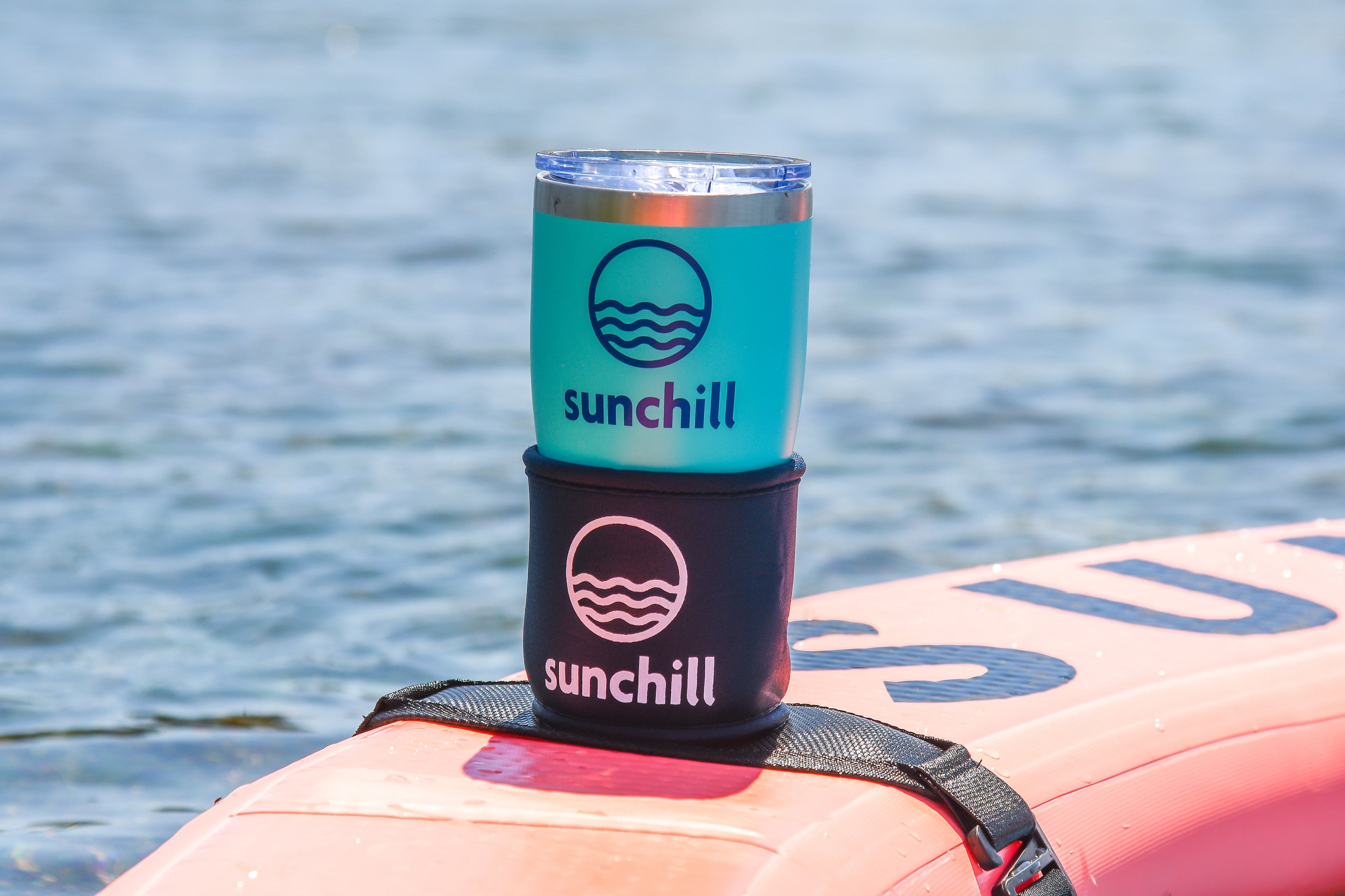 Every Sunchill comes with two strap-around drink holders — each with a thick neoprene sleeve that perfectly fits a 12-oz can (even with a koozie) and stretches to handle larger bottles or tumblers too.